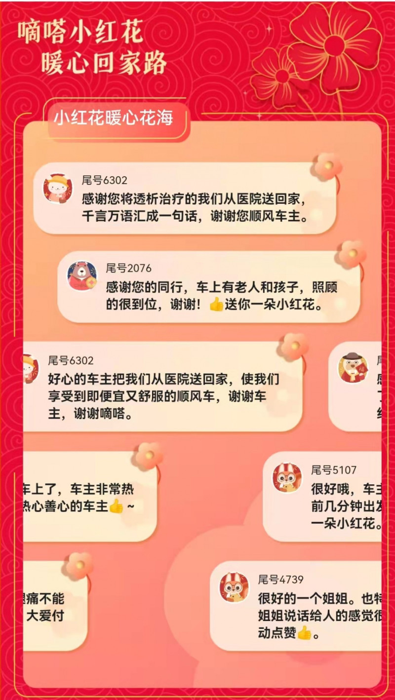 此外,作为国内最大的顺风车平台,嘀嗒出行小红花从多个侧面,真实展现出国人顺风出行中的点滴温暖日常,以独特方式传递着感恩、鼓励和希望,也一定程度勾勒出一幅中国春节顺风出行的人文全景图。从中,可以部分看到当下人们的春节顺风出行风貌,以及那并不遥远的中国人情味儿。