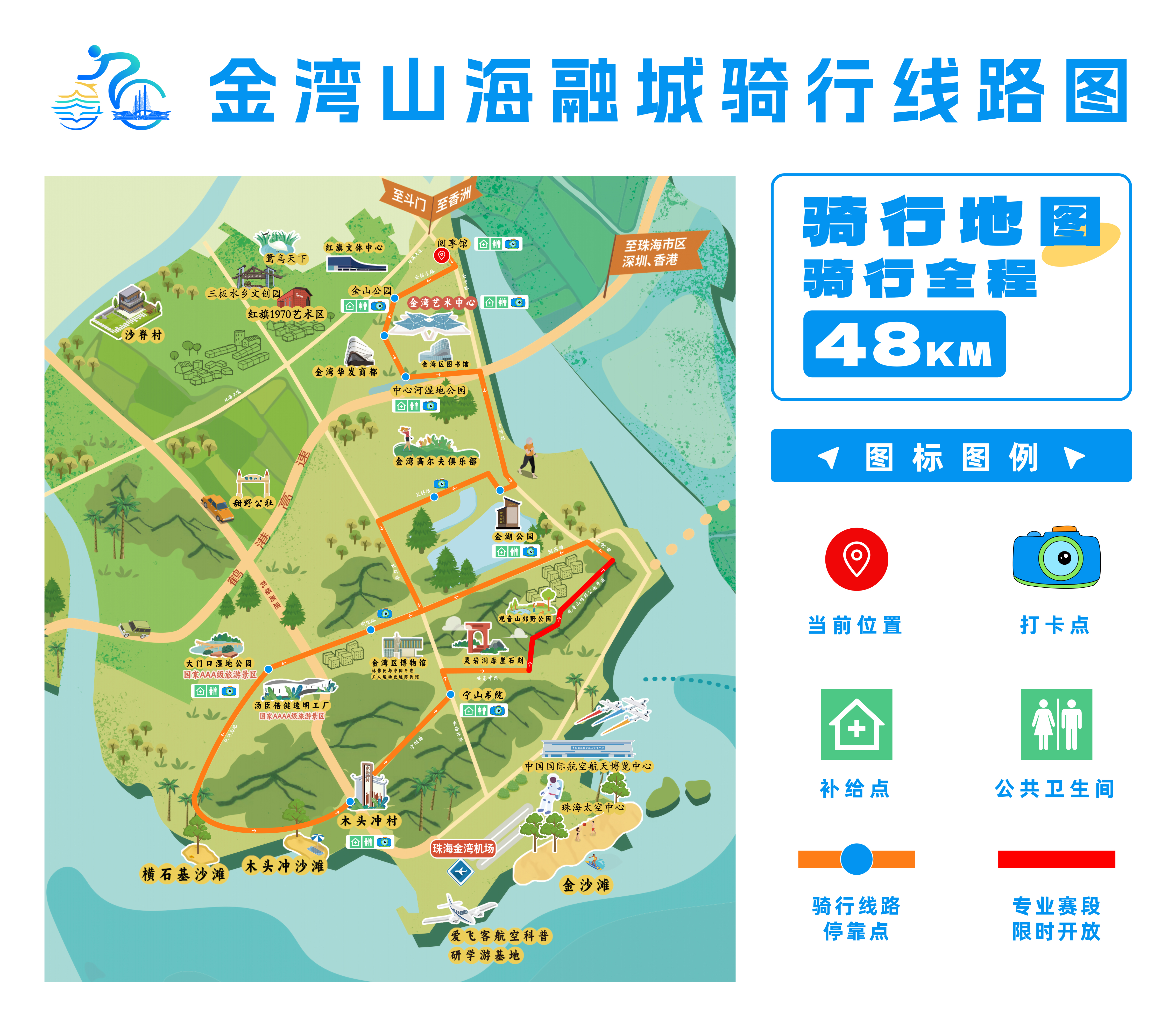 香洲区路线沿情侣路蜿蜒而行15公里,将珠澳人工岛、爱情邮局、日月贝等地标串珠成链,尽显浪漫滨海与全民健身的活力;金湾区骑行路线,是这次推出的最长路线,穿行于滨海、湖畔与湿地之间,城景交融、生态休闲,一站式满足观海、赏湖、游园的多重体验;斗门区路线16公里,深入莲洲镇田园乡村,稻香与非遗相伴,让骑行成为感受乡村振兴的生动实践;高新区路线18公里,串联古村、红树林与淇澳大桥,人文与自然相得益彰,追风淇澳岛、尽览生态之美;万山区路线12公里,置身东澳岛,山海相拥、蜜月风情,骑行过程中,感受环岛别样的海岛风情。